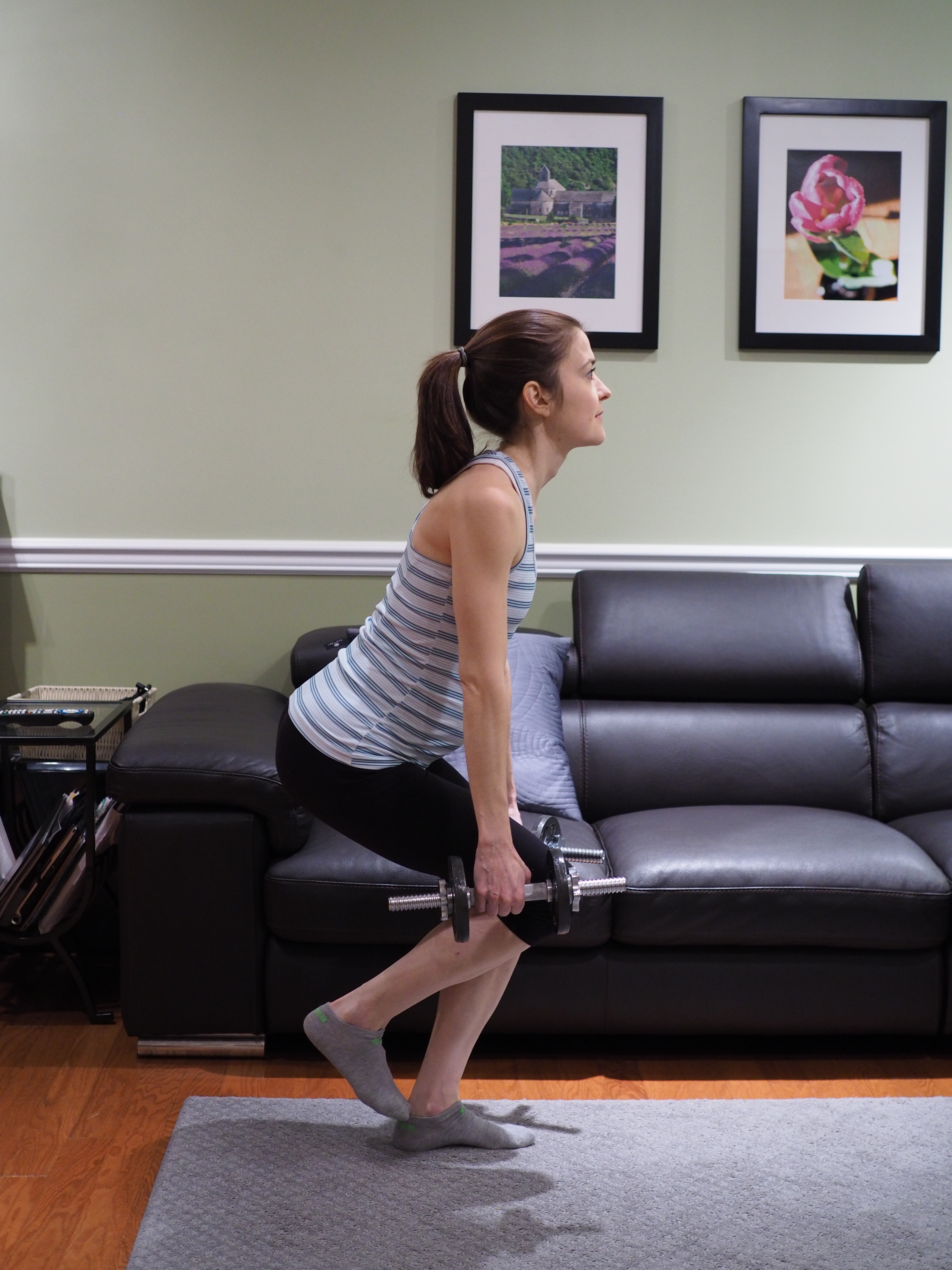 Below are five of my favorite unilateral exercises.  In some of them, notice that I’m holding a dumbbell in one hand only.  This forces your core to work harder (a good thing!) because you’re activating the muscles of your posterior oblique chain – the latissimus dorsi and oblique on the side of your body with the dumbbell, and the gluteus maximus on the opposing side.