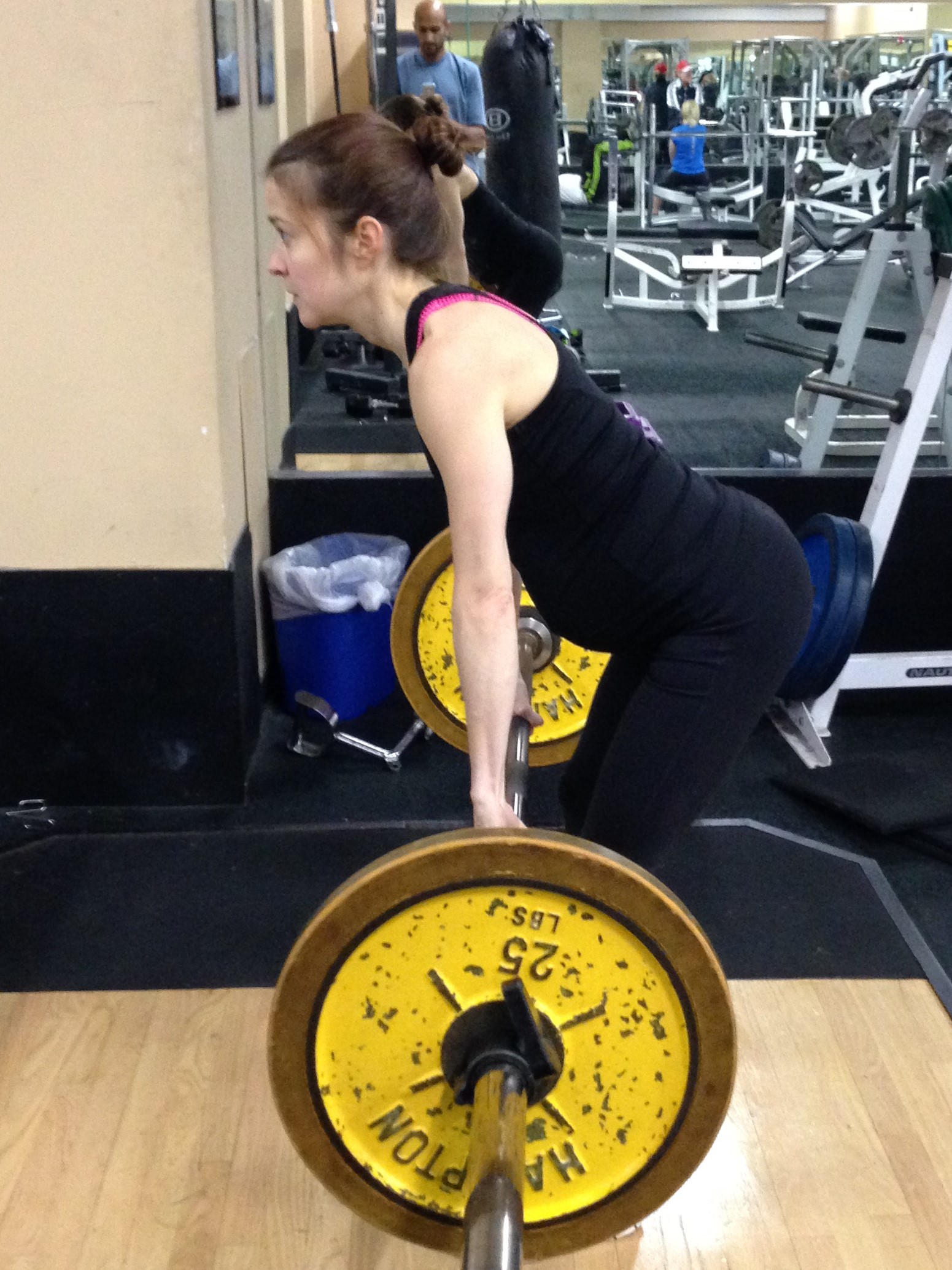 In any event, last week we worked out together during his session. I had him doing deadlifts, and then he about had a heart attack when his six-month pregnant wife stepped up to take her turn. Something in his eyes said, “Will our unborn child drop from your uterus if you pull that bar again?”